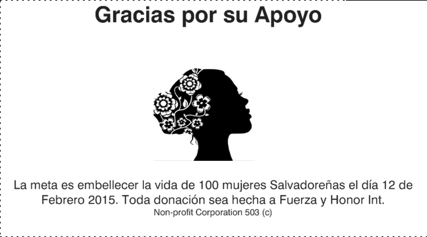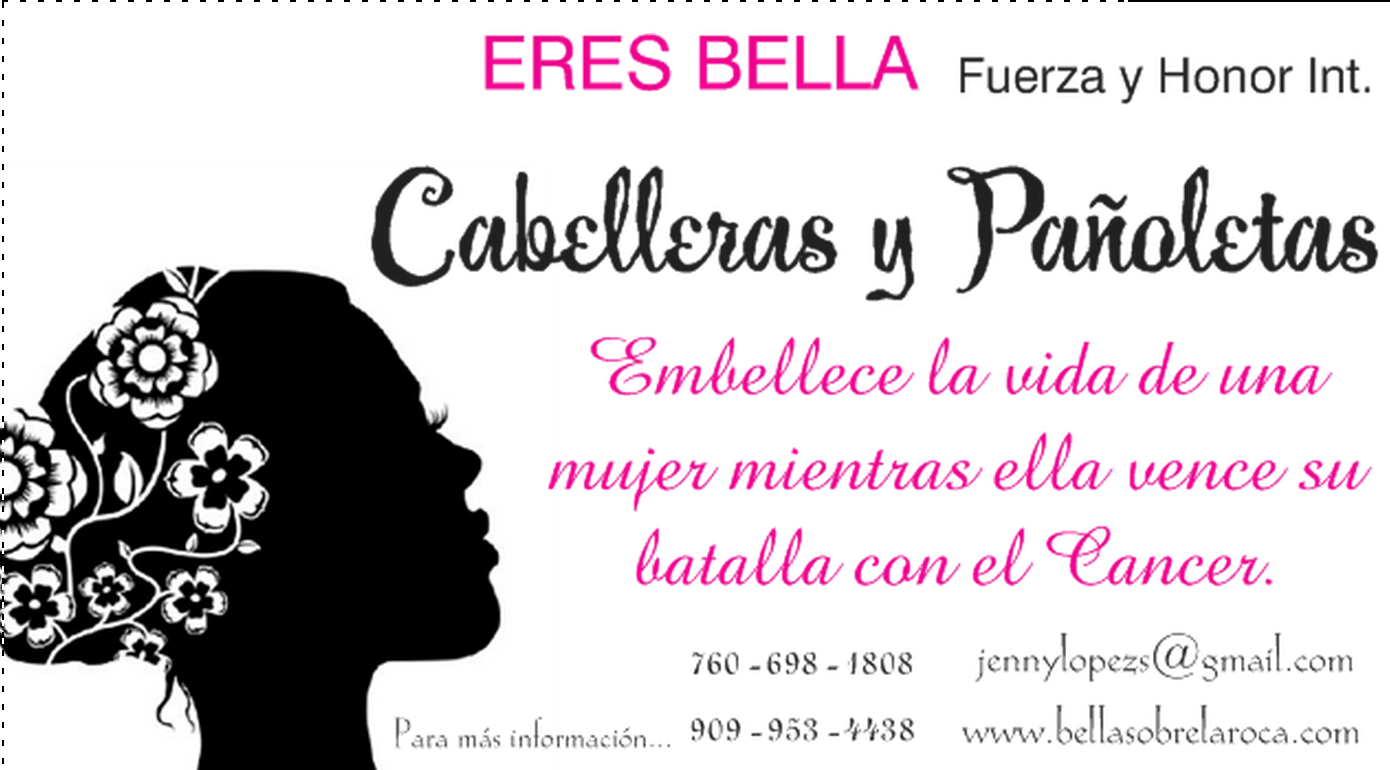 De Octubre 2014 a Enero 2015, la Organizacion Fuerza y Honor Int. (non-profit 503c) y grupo internacional de mujeres ERES BELLA, estará colectando Cabelleras artificiales y lindas pañoletas para apoyar a por lo menos 100 mujeres que están pasando por la batalla contra el Cancer en el pais de El Salvador.